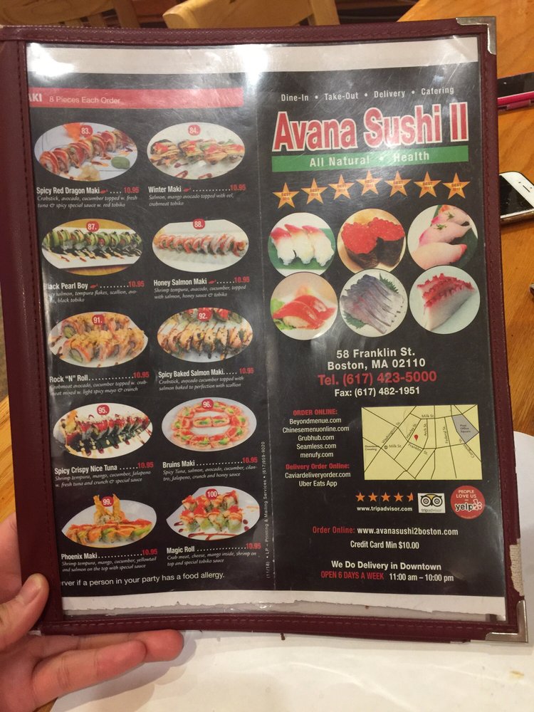Avana Sushi 2, located in downtown Boston, offers a wide range of delicious sushi options with many vegetarian choices. Customers rave about the fresh and tasty sushi rolls, such as the Spicy Red Sox, Hawaii 5-0, and Patrick roll. The restaurant also stands out for its unique use of mango in some rolls, adding a refreshing twist to the flavors. Prices are affordable, especially considering the generous amount of fish in each piece. Takeout and delivery options are popular, with the sushi arriving perfectly preserved in secure containers. Along with great food, Avana Sushi 2 provides excellent service and a welcoming atmosphere. Don't miss out on the Winter Maki, Super Man Maki, Black Pearl Maki, and Torch Salmon Maki – all highly recommended by loyal customers.